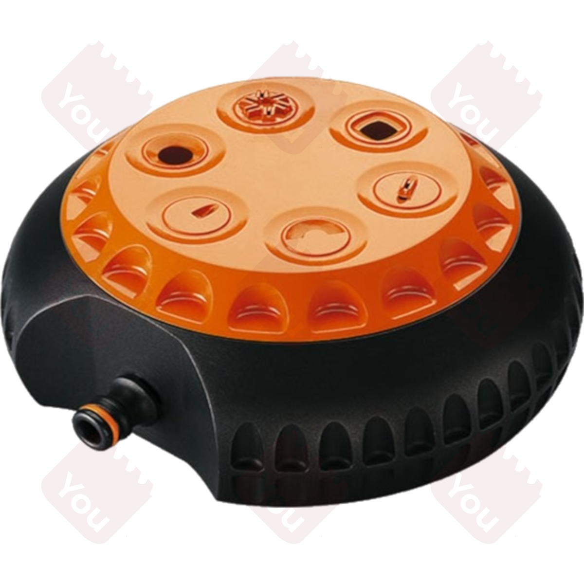 Interamente in ABS. Forma arrotondata per un facile trascinamento sul prato. Parte superiore sagomata per una facile presa. Ruotando la flangia si ottengono 6 funzioni diverse. Area bagnata 64 mq. Max portata d'acqua 34 lt/min - 4 Bar