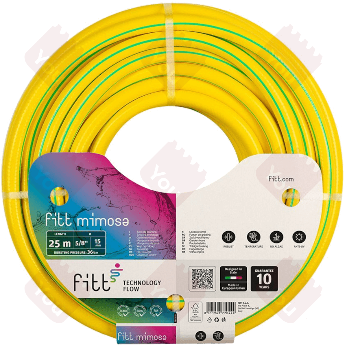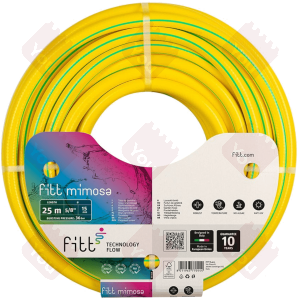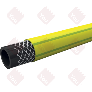 Tubo in PVC a 3 strati retinato e rinforzato, particolarmente robusto, indicato per un uso intensivo. Maggiore resistenza alla pressione grazie al rinforzo retinato in poliestere ad alta tenacità. Copertura esterna colore giallo coprente Anti UV con due righe verdi, interno nero Anti Alga.