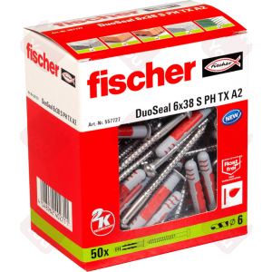 Tassello universale sigillante in nylon bimateriale per installazioni in ambienti piastrellati umidi e bagnati, resistente alle infiltrazioni. Con vite in acciaio INOX A2 impronta TORX. Impermeabilità confermata dai test secondo ETAG 022 e DIN 18534 fino alla classe di esposizione all'acqua W3-I. Per pareti in cartongesso, pannelli truciolari, muratura piena, muratura forata, calcestruzzo.