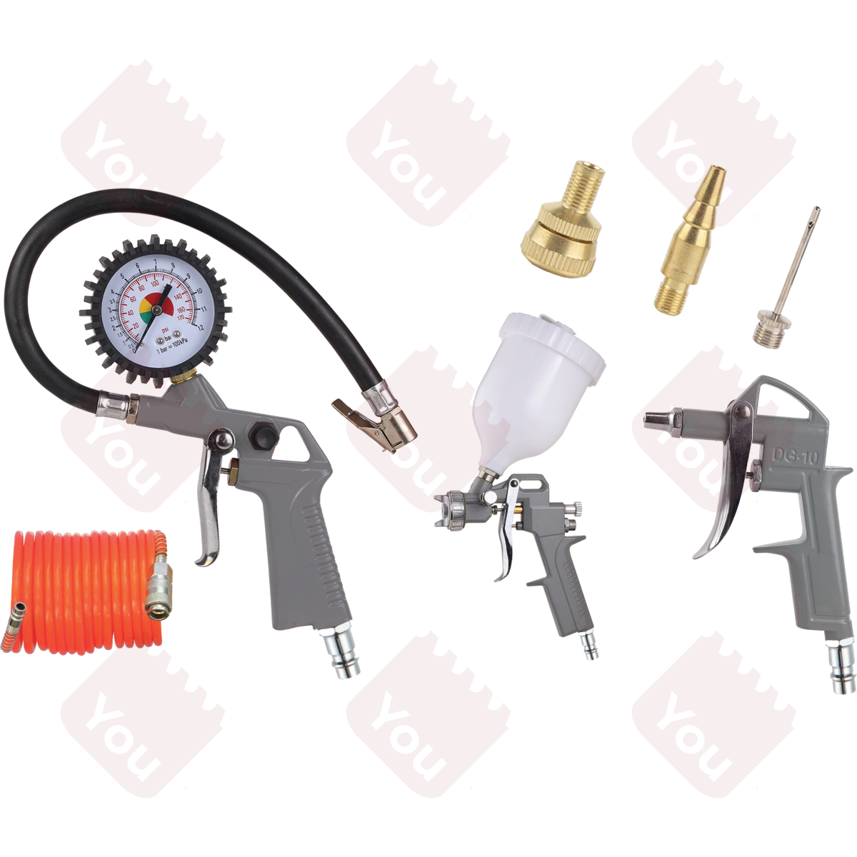 Kit accessori per aria compressa – 7 pezzi con innesto rapido. Include: pistola per verniciatura, pistola per soffiaggio, pistola per gonfiaggio con manometro, tubo spiralato con rubinetto e raccordi in ottone per palloni, bici e gommoni. Pratico e completo per ogni esigenza di gonfiaggio e pulizia.