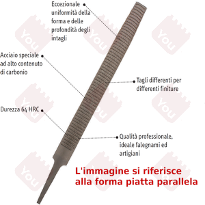 Le raspe per legno Piatte Parallele SENZA manico (articolo 10) sono realizzate partendo da una barra di acciaio speciale, tramite lavorazioni meccaniche di fucinatura, molatura e intagliatura. Vengono poi sottoposte a trattamento termico di cementazione. L'impiego delle migliori tecniche oggi disponibili permette di produrre raspe caratterizzate dalla eccezionale uniformità della forma e della profondità dei denti, che consente una lavorazione più agevole ed efficiente. Sono adatte ad una grande varietà di impieghi, sia a carattere industriale sia artigianale: possono essere utilizzate per la lavorazione del legno, del piombo, dell'alluminio, delle leghe leggere, dei materiali plastici e del cuoio. L'eccellente qualità delle raspe Stella Bianca per legno consente di ottenere risultati ottimali anche dopo un uso prolungato nel tempo.