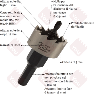 - Attacco sfaccettato per non scivolare nel mandrino (con Ø tazza > 18 mm); attacco cilindrico (con Ø tazza < 18 mm)