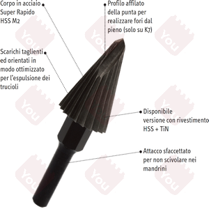 - Profilo affilato della punta per realizzare fori dal pieno (solo su K7, art.03007 e 03007M)