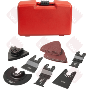 Questo set di 18 accessori per utensile multifunzione è composto da una lama segmentata per segare vicino a bordi e angoli, due lame per il taglio a tuffo per eseguire tagli a tuffo profondi in legno, plastica o metallo, due lame raschianti per rimuovere residui di materiale e un platorello con diversi tipi di carta abrasiva.