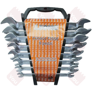 Chiavi fisse in acciaio cromo vanadio. Serie 8 pz: mm 6x7 - 8x9 - 10x11 - 12x13 - 14x15 - 16x17 - 18x19 - 20x22