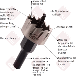 - Attacco sfaccettato per non scivolare nel mandrino (con Ø tazza > 18 mm); attacco cilindrico (con Ø tazza < 18 mm)