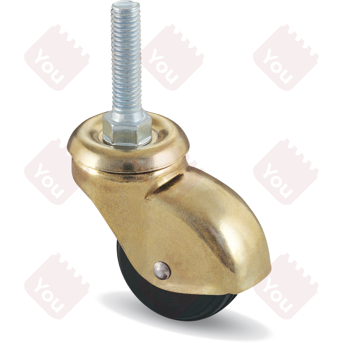 Supporto a cuffia in acciaio stampato ottonato o zinco-cromato su doppia corona di sfere. Ruota in gomma nera. L’impiego è consigliato per carrelli portalavoro, girelli per bambini, fioriere, etc.