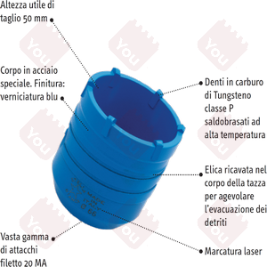 Altezza tazza: 65 mm. Altezza utile: 50 mm. Montata di preferenza su trapani rotobattenti o su tassellatori.
