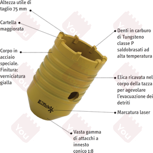 La Corona Pesante con innesto conico (articolo 77) è dotata di denti in metallo duro A PASSO VARIABILE classe P di grandi dimensioni, riportati su di un corpo di acciaio speciale. Queste caratteristiche tecniche la rendono adatta a forare con facilità e precisione calcestruzzo, conglomerati cementizi, pietre o murature. Altezza tazza: 100 mm. Altezza utile: 75 mm. Montata di preferenza su martelli perforatori pesanti, quali i martelli elettropneumatici. Sono disponibili 2 versioni, con attacchi differenti: foro conico da 1/8 (art. 77): consente l'innesto di gambi di varia lunghezza (250 mm, 450 mm, 600 mm, 800 mm) adattabili ai più comuni martelli in circolazione, quali Esagono 13, Esagono 19, Millerighe, SDS Max, SDS Plus. Sui martelli SDS Plus possono essere montate solo frese aventi diametro non superiore a 50 mm. Filetto a Molla (art. 77F): dotate di attacco filettato a molla. La molla attutisce i colpi e permette un più agevole smontaggio. Disponibili gambi da 450 mm per i più comuni martelli in circolazione.